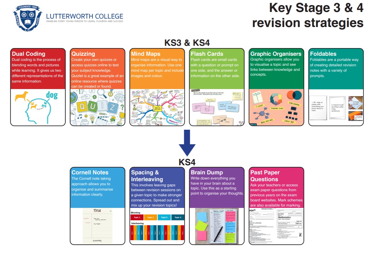 At Lutterworth College students are taught 10 key revision strategies in mentor and subject time. The strategies are: